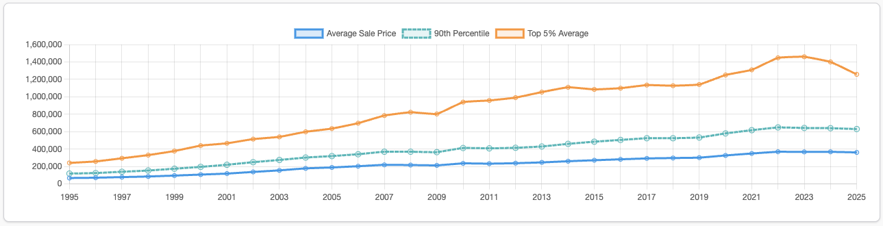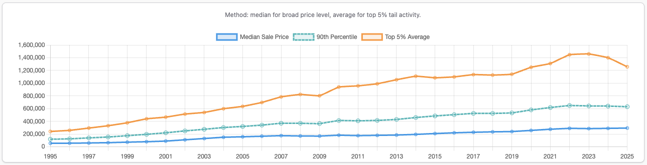Take this chart, for example, which uses an average sale price across England/Wales. Using an average means higher-value sales are allowed to influence the result, which pulls the line around when very large transactions occur. For a broad market view that can be acceptable, but it does introduce distortion when the aim is to understand what most buyers are actually paying. The top 5% average is fine; it’s a much narrower dataset and will naturally look choppy. We want to see that movement there, it’s signal, not a distortion, because outliers are part of the story at that end of the market.